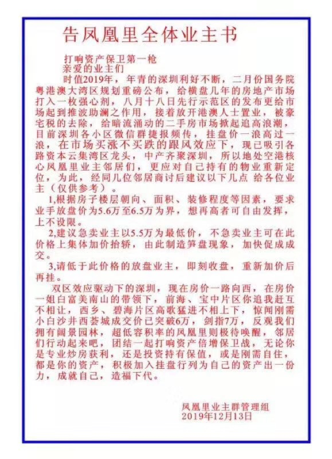 在此前网上流传的一份《告凤凰里全体业主书》中,明确指示业主放盘价统一调至5.6万元~6.5万元,并要求低于指导价格的放盘业主,即刻收盘,重新加价后再挂。