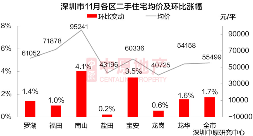 11月,深圳全市二手住宅均价为55499元/平方米,环比上升1.7%,七个区均价均有所上升。受今年政策影响,南山、宝安利好较多,价格上升幅度也相对较大。南山区均价95241元/平方米,环比上升4.1%,涨幅最大;宝安区成交1985套,继续刷新年内新高,连续四个月成为成交最热区域。