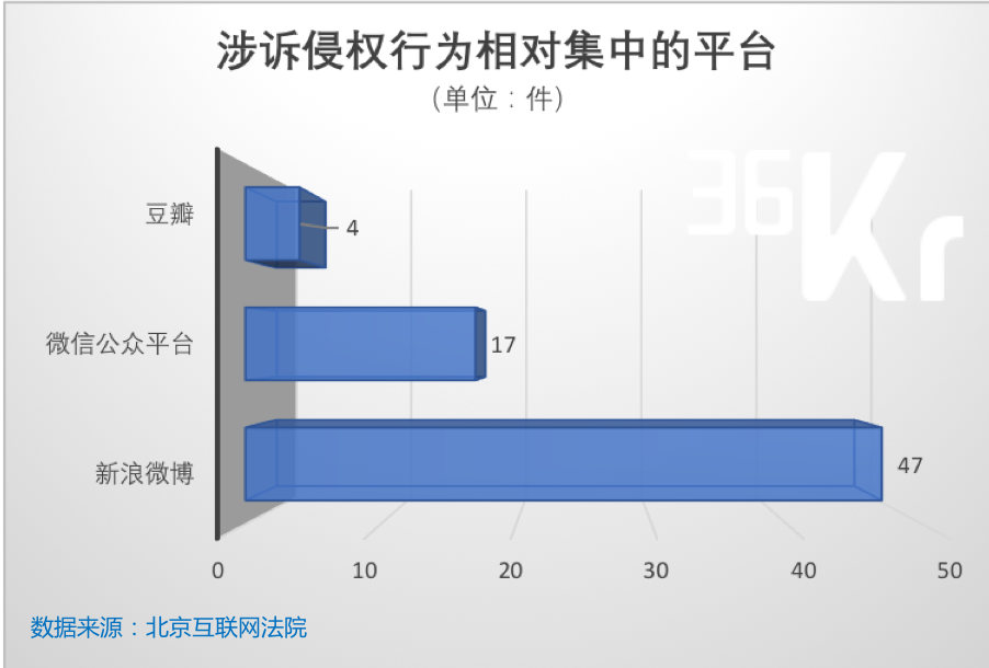 此类涉诉侵权行为包括使用侮辱性语言、捏造事实等。其中,涉嫌捏造事实的案件共有105件,涉诉侵权行为相对集中于社交平台,包括新浪微博(47件)、微信公众平台(17件)及豆瓣(4件)等。