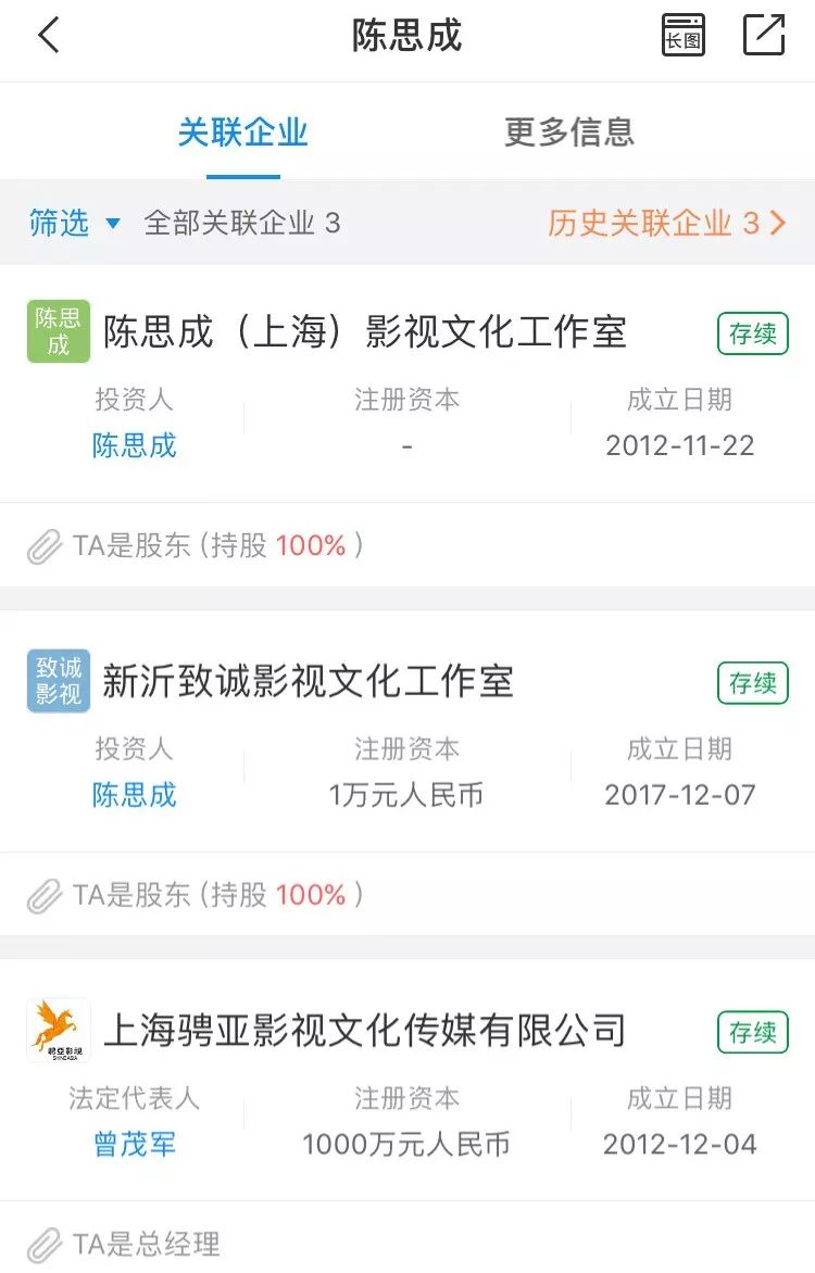 与韩寒、郭帆等新锐导演相比,陈思诚在资本市场上并不活跃,仅投资两家公司,分别为陈思成(上海)影视文化工作室、新沂致诚影视文化工作室,持股比例均为100%。