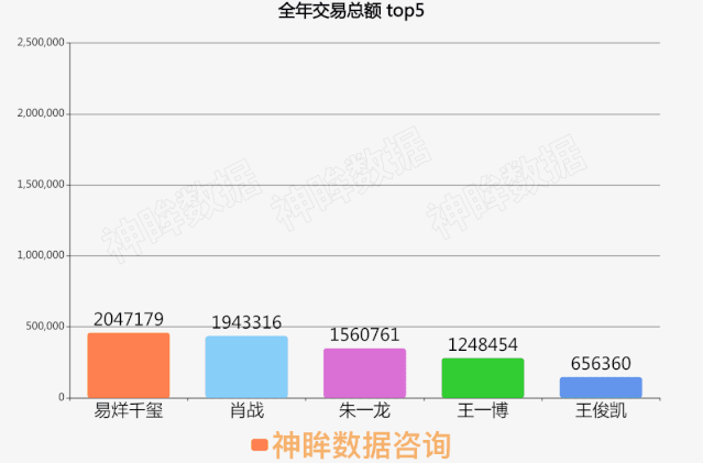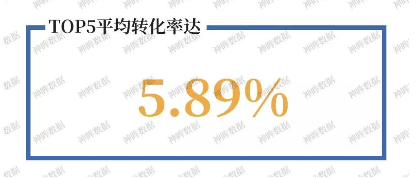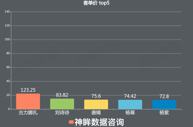 排名前五的明星艺人在其他指标上的名次都靠后,而整个排名都和其他指标的排名趋势不相符——基本上,其他指标的排名情况落差不大,搜索次数高相应的转化率也靠前,转化率靠前的交易总金额也不会差。