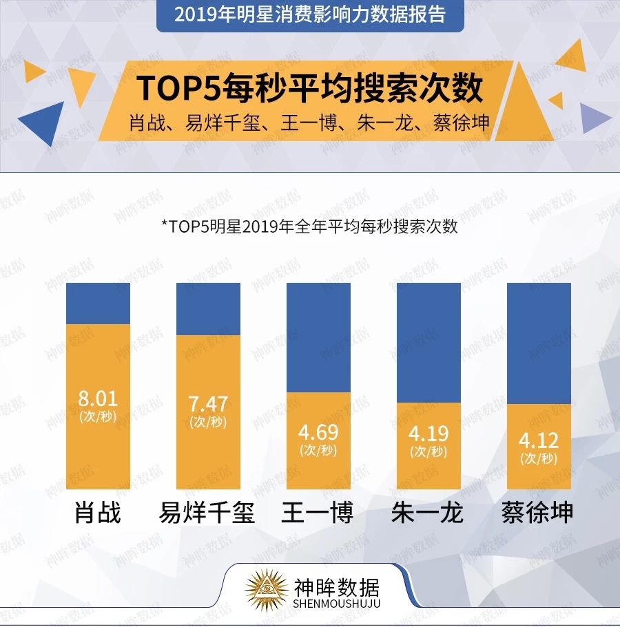 也就是说,在近一年里,人们平均每秒会在淘宝上搜 8.01 次肖战的名字,7.74 次易烊千玺的名字,即便是名单中最后一位的刘诗诗,也平均每小时被搜索 5.59 次。