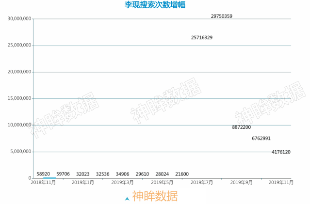在今年六月份中,平均 每秒有 9.92 次搜索李现的行为,这个数字在七月份达到了 每秒 11.1 次。