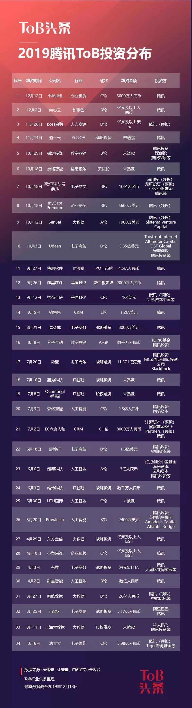 虽然阿里从基因上更ToB,可并不能说明基因更ToC腾讯在B端市场没有一战之力。即便2019年腾讯在ToB市场上的投资总额没有阿里高,可腾讯的投资仍然有很多亮点。