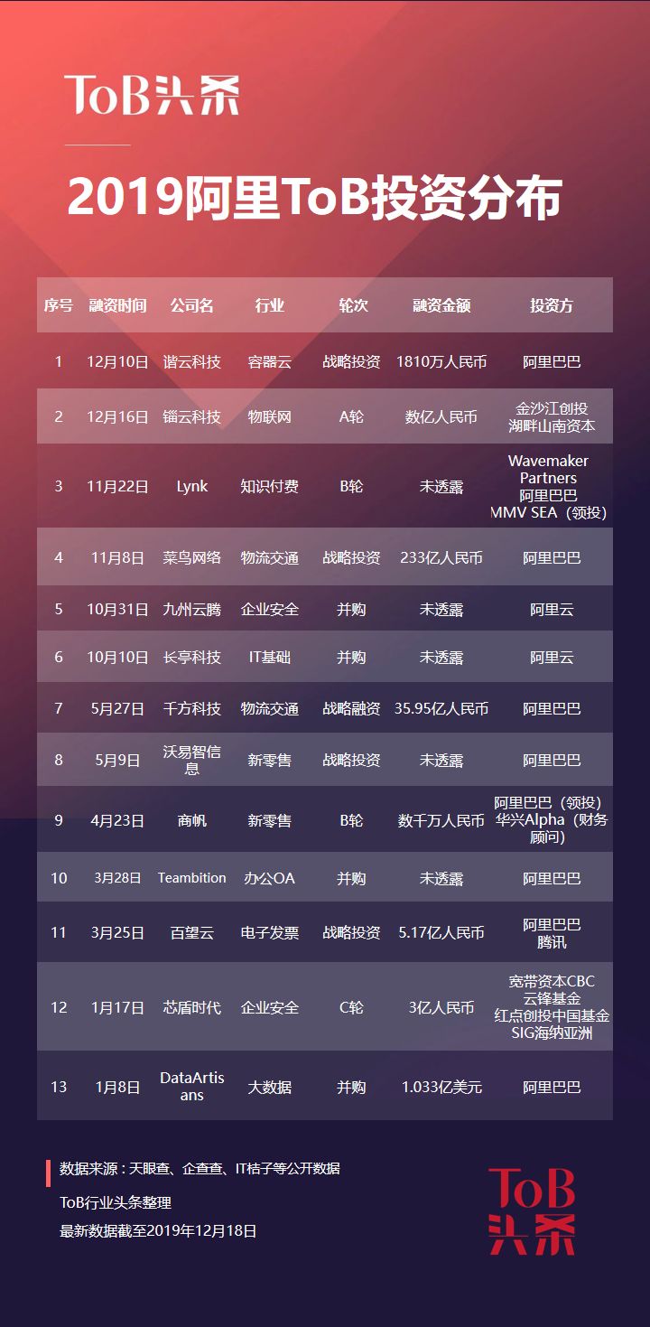 据「ToB行业头条」估算, 2019年阿里在ToB市场的总投资额在300亿人民币上下 ,其中投资阿里系的亲孩子——菜鸟网络就花了233亿人民币,留给其他ToB企业的钱只有100亿人民币左右。