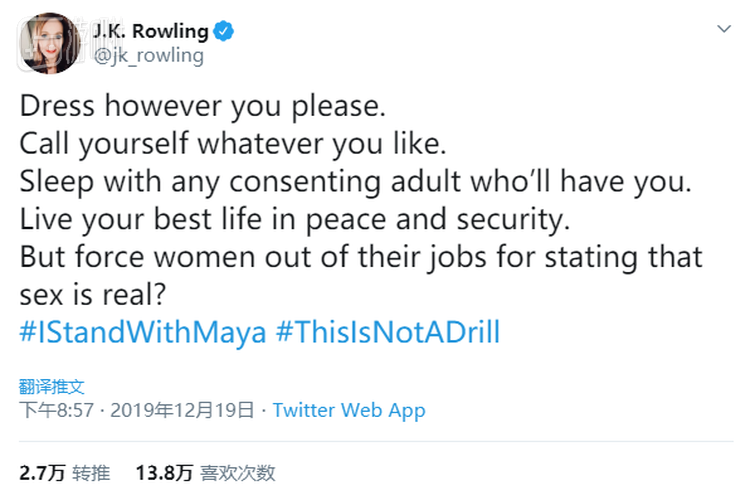 人们可以做任何他们想做的事,但坚持“性别无法改变”的观点就得被解雇?J·K·罗琳发了条推文表达自己的质疑,并且加上了“我支持Maya”(#IStandWithMaya