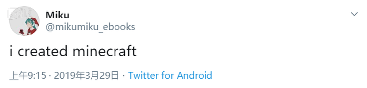她用这个以“Miku”为名的账号发了一条简短的推,只三个单词——我创造了《我的世界》。