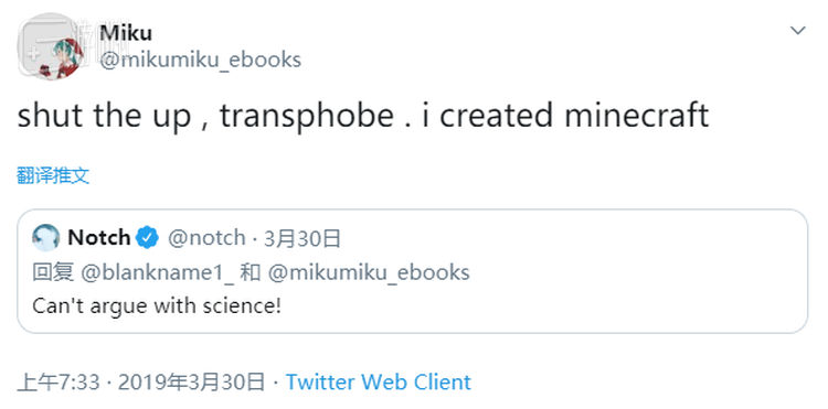 今年早些时候,《我的世界》的创造者Notch同样因为涉及“歧视跨性别者”而备受抨击。他公开表示“性转女”只不过是“以为自己是女性”(其实并不是),而作为回应,大批《我的世界》的玩家随即表示《我的世界》其实也没有创造者,这款游戏来自太空。